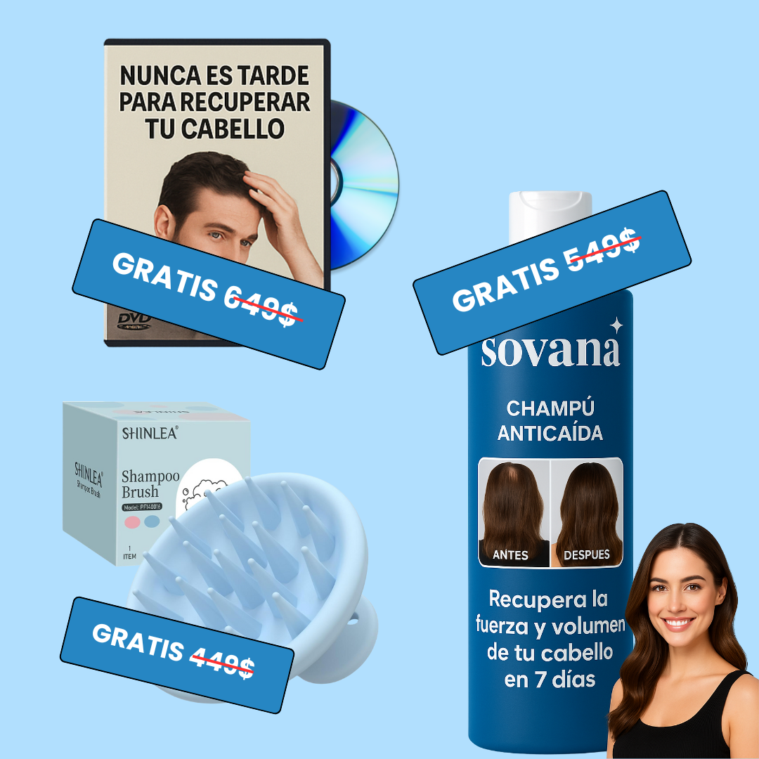 te regalamos otra unidad del Champú Sovana™, el video curso "Nunca es tarde para recuperar tu cabello" y nuestro Recover+, el masajeador folicular de mayor estimulación de mercado