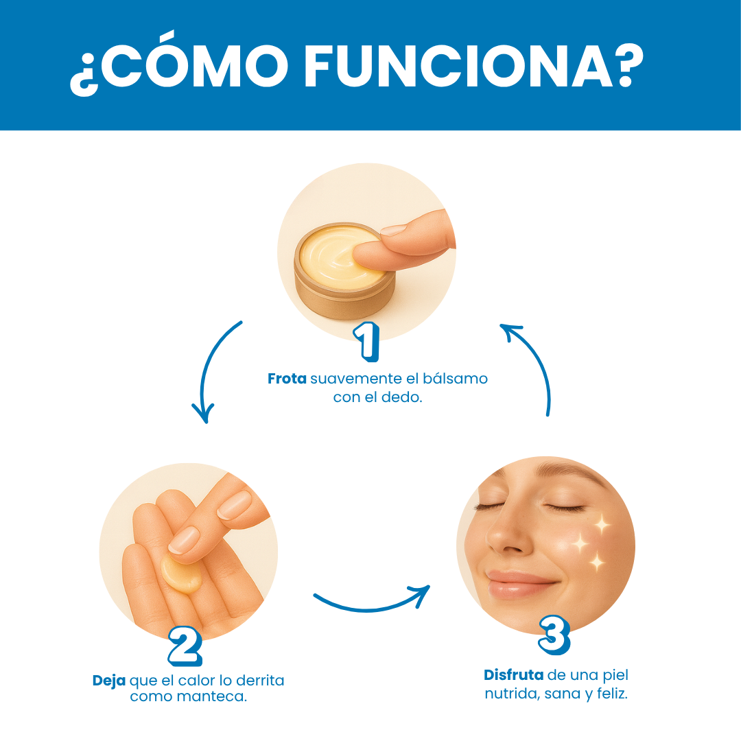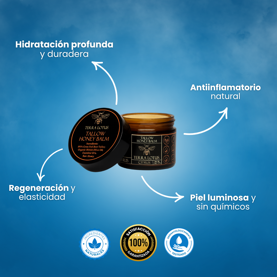 Contiene sebo de res alimentado con pasto (grass-fed tallow) y miel cruda sin procesar. Nada más. Nada artificial.
